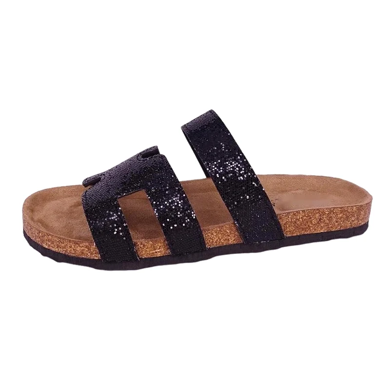 Damskie korkowe sandały TIANXIU w stylu H natychmiast podnoszą styl Twojego domowego i codziennego obuwia dzięki wyjątkowej, brokatowej, modnej cekinowej dekoracji. Przyjmując nowoczesną, minimalistyczną koncepcję projektu, ten pantofel łączy w sobie klasyczne i modne elementy, dzięki czemu każdy krok emanuje urzekającym urokiem. Opaski H: Dwa starannie zaprojektowane paski krzyżowe H zapewniają stabilność i komfort noszenia kapci. Wykonane z wysokiej jakości materiałów, są miękkie i trwałe, skutecznie dopasowują się do kształtu stopy i minimalizują poślizg podczas spacerów.