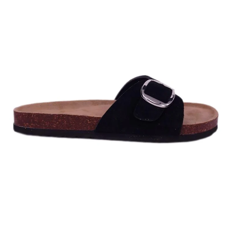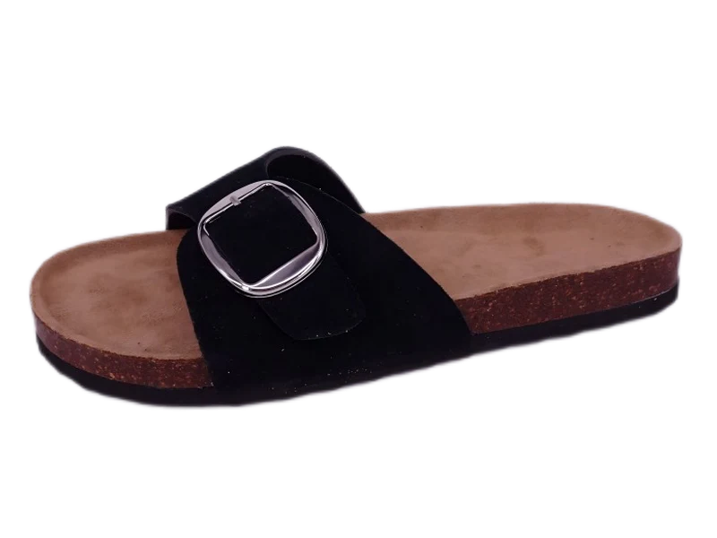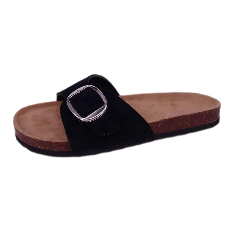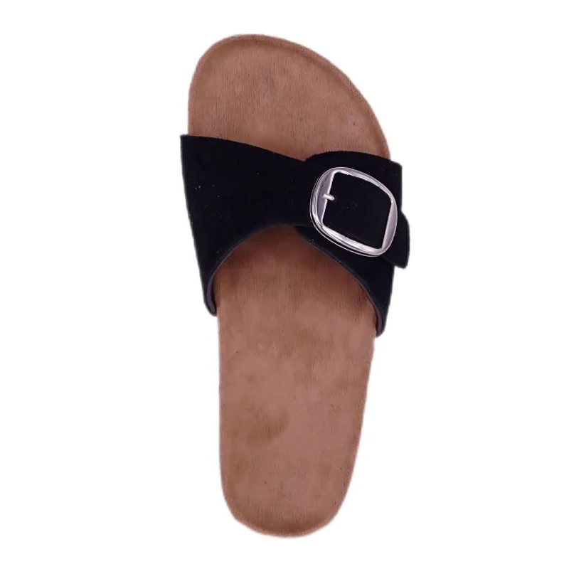 TIANXIU Damskie sandały z prawdziwej skóry zamszowej z jednym paskiem i klamrą, z dużą metalową klamrą, uroczystą i elegancką czarną powierzchnią buta, brązową podeszwą z naturalnego materiału oraz minimalistycznym, ale modnym stylem, wyróżniają się spośród wielu kapci. Niezależnie od tego, czy jest noszony w domu, czy na spokojny spacer na świeżym powietrzu, pokazuje gust i styl użytkownika.